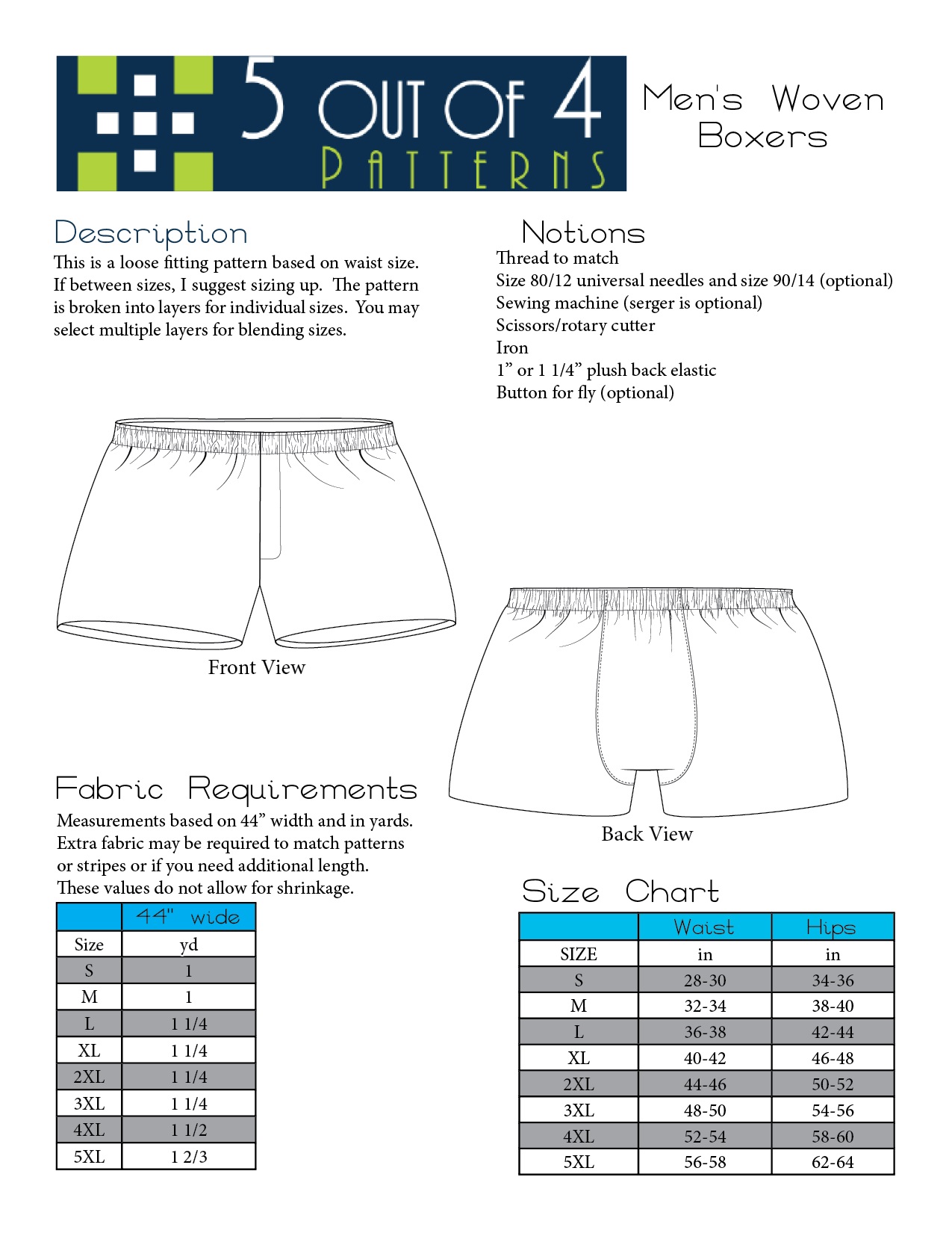 Specifikace: 5 out of 4 Patterns Woven Boxer Shorts Downloadable Pattern