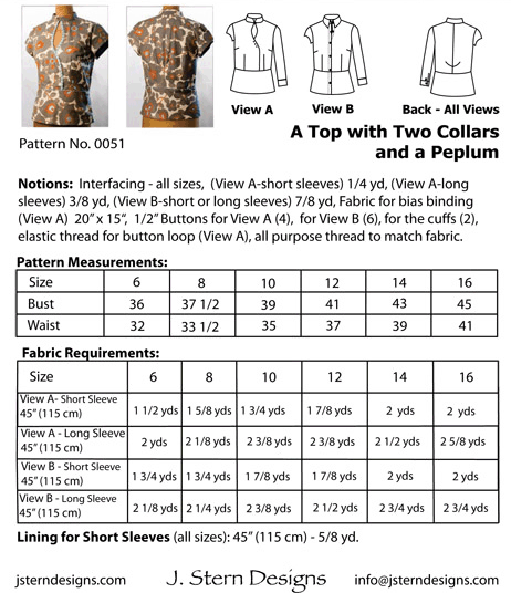 🧵 Downloadable pattern: J Stern Designs Top with Two Collars and a Peplum 0051. ✂️ Perfect for DIY sewing projects.