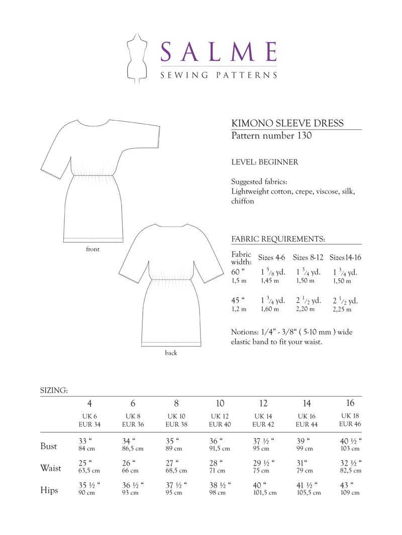 Spécification: Salme Sewing Patterns Kimono Sleeve Dress Downloadable Pattern 130
