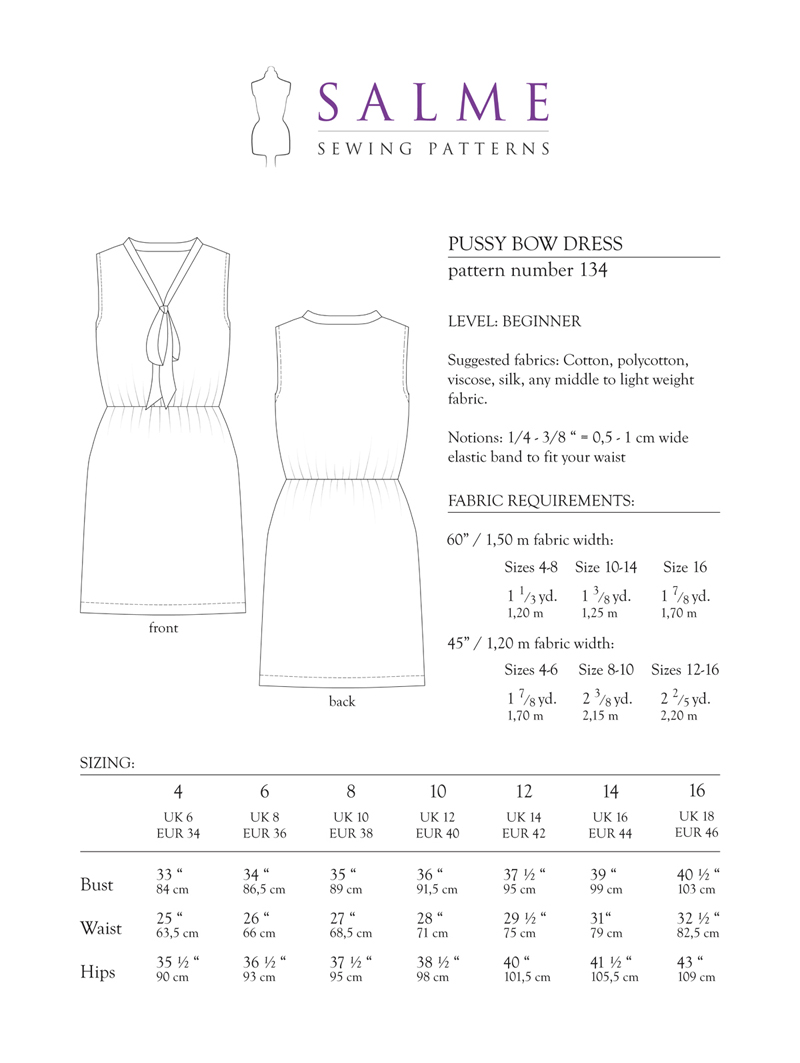 Spécification: Salme Sewing Patterns Pussy Bow Dress Downloadable Pattern 134