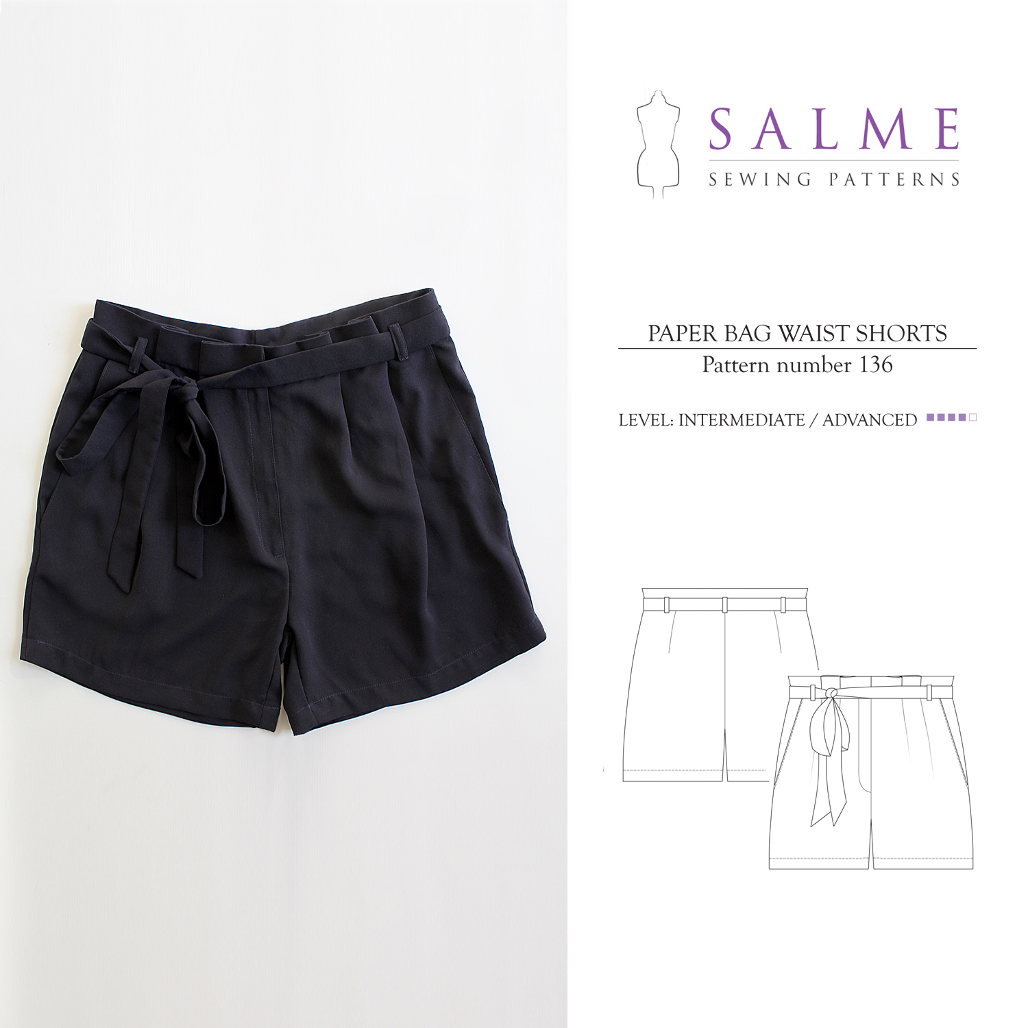 Salme Sewing Patterns Paper Bag Waist Shorts Downloadable Pattern 136