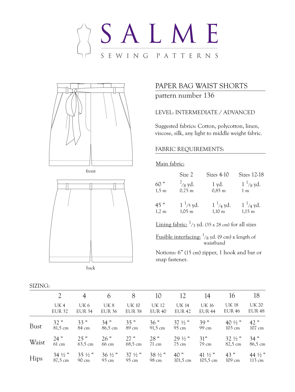 Spesifikasi: Salme Sewing Patterns Paper Bag Waist Shorts Downloadable Pattern 136
