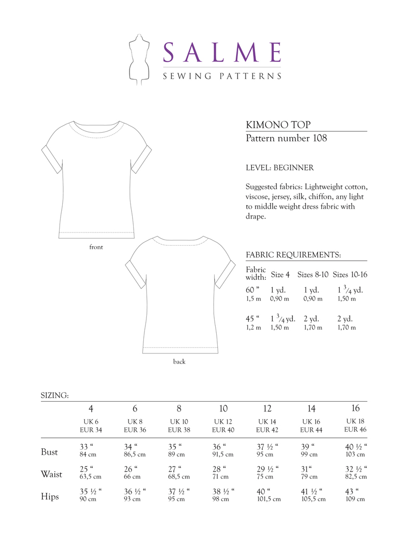 Salme Sewing Patterns Kimono Top Downloadable Pattern 108