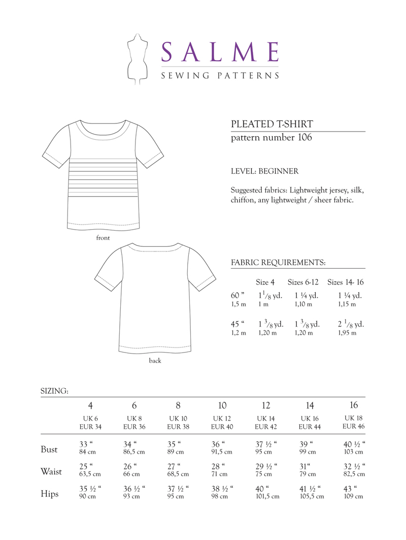 🧵 Downloadable pattern: Salme Sewing Patterns Pleated T-Shirt Downloadable Pattern 106. ✂️ Perfect for DIY sewing projects.