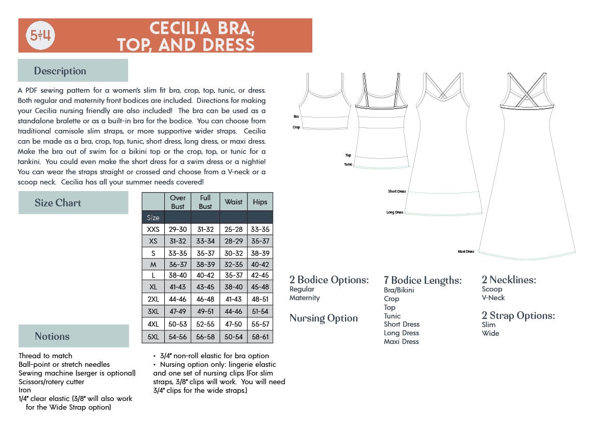 Especificação: 5 out of 4 Patterns Cecilia Bra, Top, and Dress Downloadable Pattern